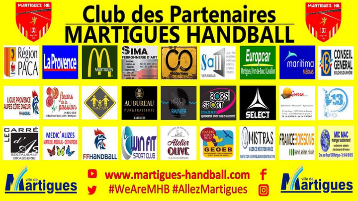 Le club des partenaires - Martigues Handball : Borsi Sport / McDonald's Martigues / Europcar Martigues-Port-De-Bouc-Avignon / Green Games Production / Sam Vérandas / Au Bureau Martigues / Select Handball / France Boissons / Twincom / Médic'Alizés / Rainier Rodriguez / Mistras Group / Atelier Olive / Fleur de la Passion / Restaurant le Carré d'As / La Provence / Maritima / Mic Mac Martigues / Ville de Martigues / Region Paca / Département des Bouches-du-Rhône / Fédération Française de Handball / Comité 13 / Ligue Provence Alpes Côte d'Azur de Handball / Win fit Martigues / GEOEB / Entreprise Guerra / Sima Ferronnerie d'art