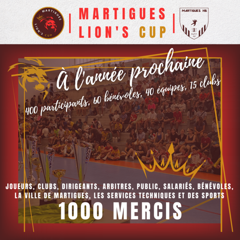 Nous tenons à remercier de nouveau l'ensemble des participants et tout ceux qui ont permis que cette première soit une réussite. Autant vous dire que l'on vous donne déjà rendez-vous pour l'édition 2024 avec l'ambition de faire de ce tournoi du Martigues Handball l'un des évènements majeurs de la région chaque fin de saison. Vive la Martigues Lion's Cup !!!